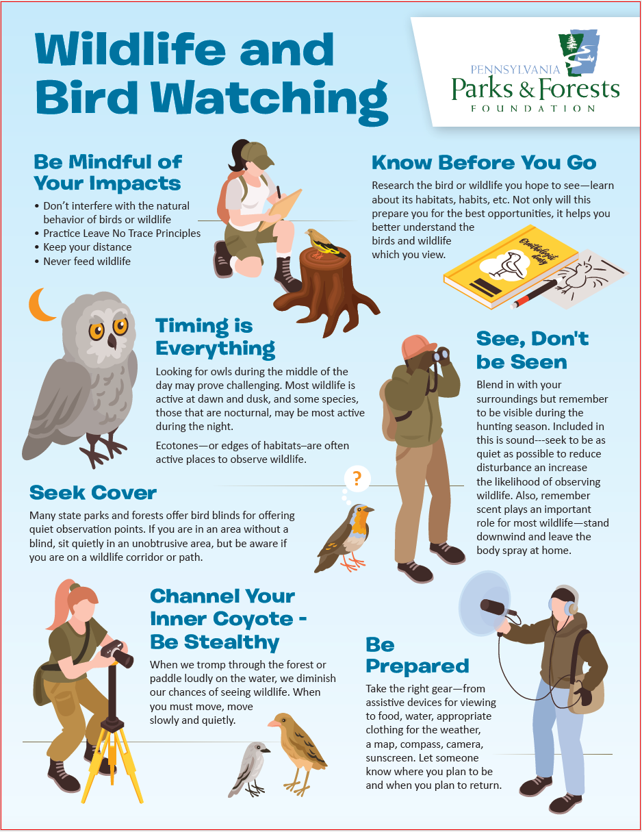 “Pennsylvania’s state parks and forests, as well as our other public lands, provide so many wonderful opportunities to view wildlife,” added Mowery. “If done in a quiet and respectful manner, wildlife watching can be an awe-inspiring activity for people of all ages, with physical and mental benefits that can last a lifetime.”