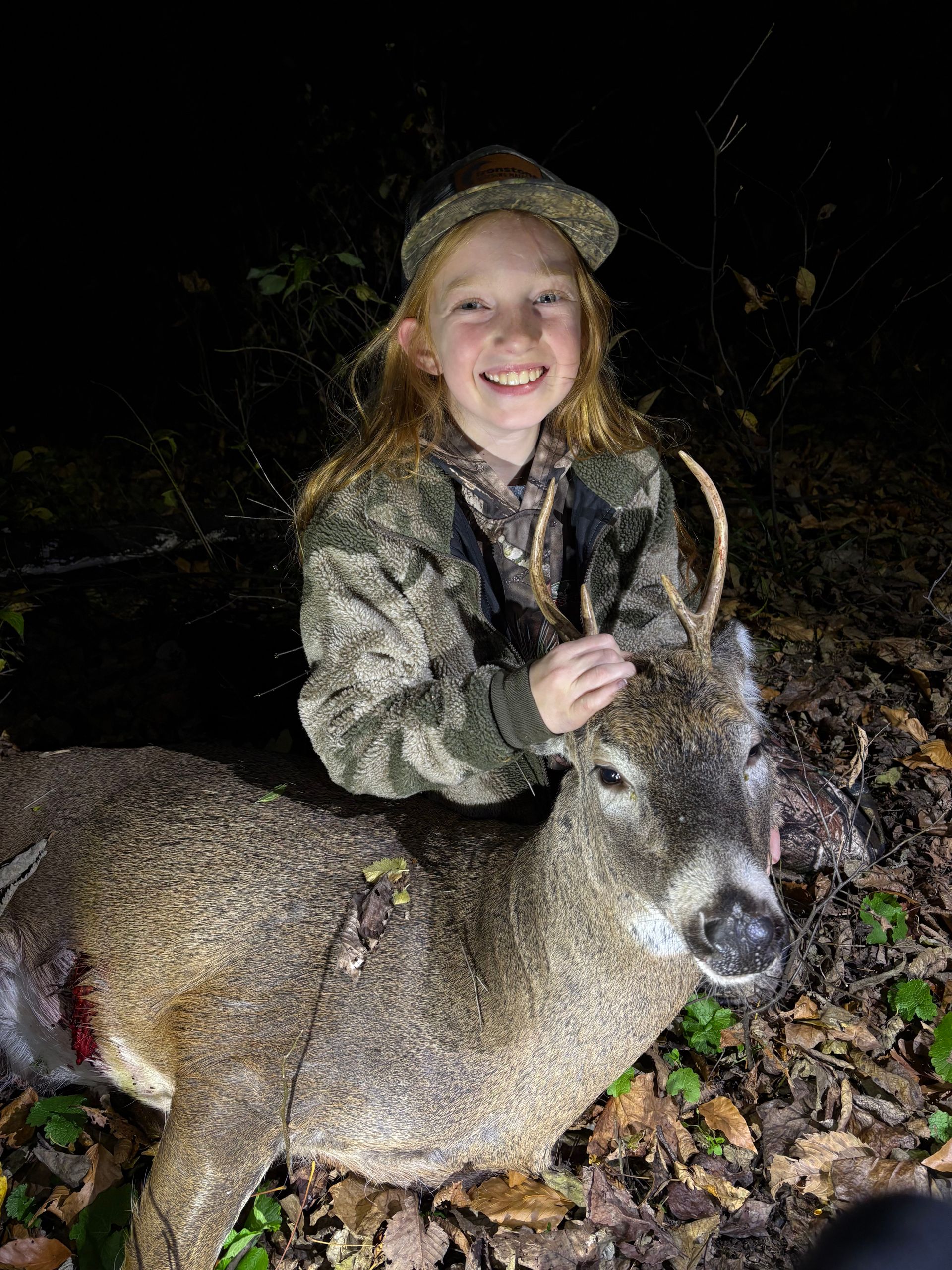 Eight-year-old Natalie moore shot her first buck at 35 yards with her crossbow.
